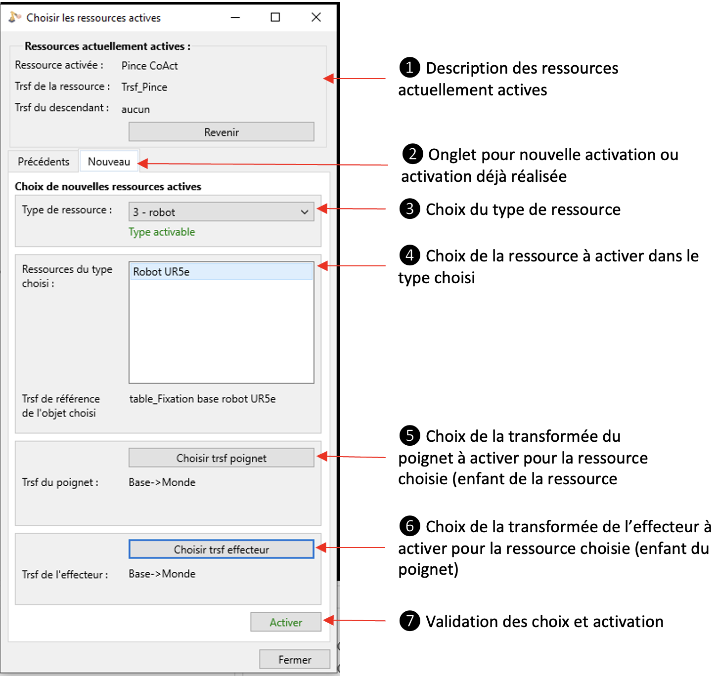 Tous les choix ne sont pas à faire (taleau V.1), car certaine ressources, activables, ne sont pour autant pas dotées d’axes (APIs) ou ne sont pas des robots (pas de modèle géométrique, donc pas de transformée effecteur à définir – cas des mécanismes ou des outils).