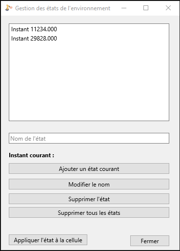 L’utilisation des états de départ permet de manière simple de remettre toutes les ressources de l’environnement et les transformées dans un état conforme au démarrage d’une simulation. Il évite donc de recharger le fichier d’environnement à chaque nouvelle simulation.