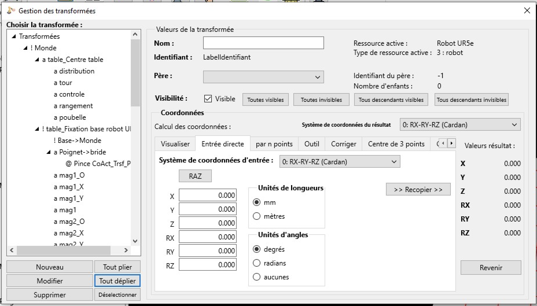 - « outil » pour lire les coordonnées depuis la position de l’outil du robot actif. Ces coordonnées seront recalculées pour qu’elles soient dans le repère du père choisi