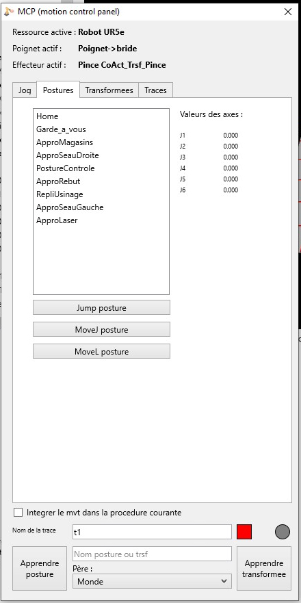 Ce mode de déplacement (figure V.3) permet d'envoyer la ressource sur la posture (ensemble de variables articulaires) choisie. Les postures ont été préalablement définies dans le menu Ressources > Gérer les postures ou bien apprises avec le MCP.