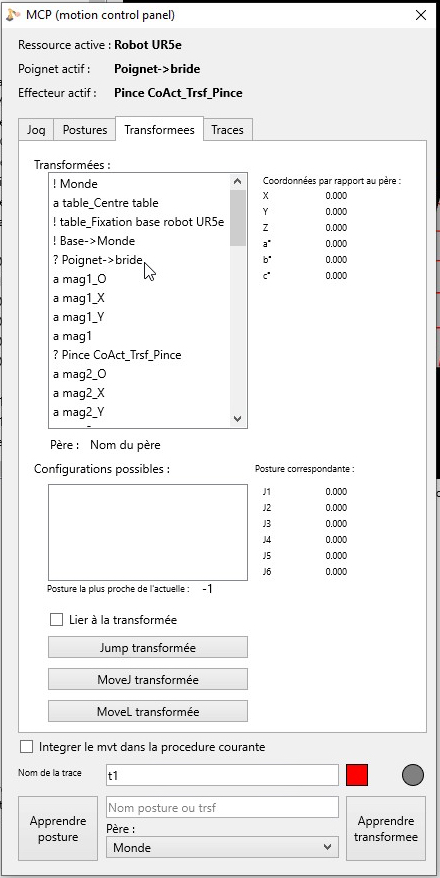 - la liste "Configurations possibles" se documente. Il convient de choisir l'une des configurations proposée pour que le mouvement soit réalisable.