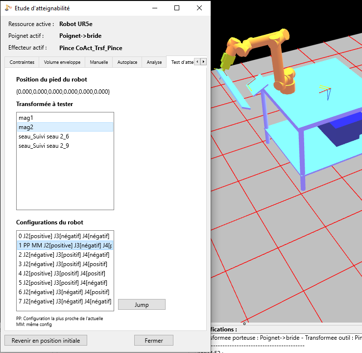 Lorsque le robot est positionné à un emplacement satisfaisant, l’utilisateur peut tester visuellement l’atteignabilité ce chaque cible (figure V.89 en sélectionnant l’une d’entre elles, puis une des configurations possibles. Ces deux sélections positionnent le robot depuis l’emplacement choisi, sur la cible choisie selon la configuration choisie.